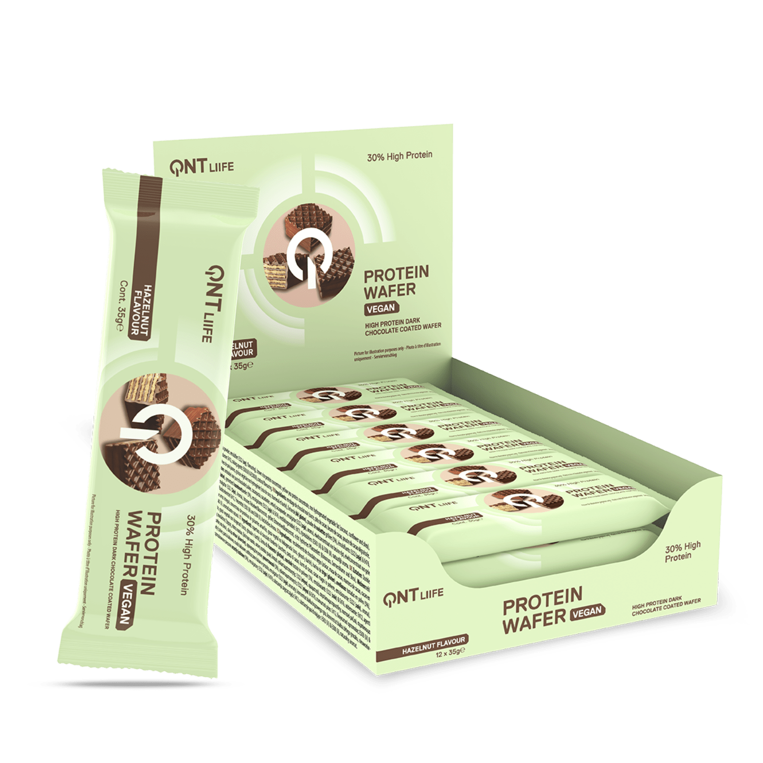 QNT Vegan Protein Wafer ist kalorienarm (nur 181kcal), aber reich an Protein (30%) mit einem Zuckergehalt von nur 3,2g pro Waffel.