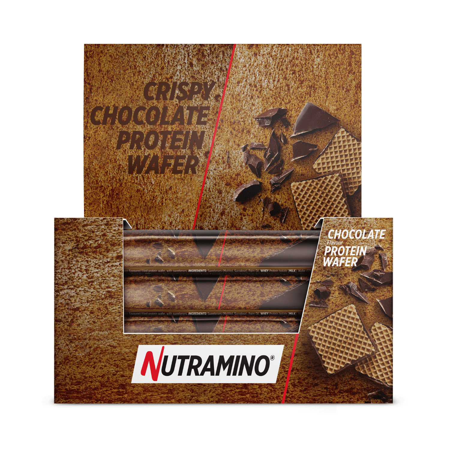 Sweeteners (Maltite, Sucralose), Palm oil, Milk protein isolate [MILK], Waffles (17%) (Corn flour, Starch, Low-fat cocoa powder, Sodium chloride, Emulsifier: SOJA lecithin; Thickening agent: Guar gum; Baking powder: Ammonium carbonate; Antioxidant: Ascorbic acid), Low-fat cocoa powder (9.6%), Cocoa mass (2.4%), Bulking agent (Polydextrose), Almond mass, Cocoa butter (0.5%), Inulin, Flavours, Emulsifier (SOJA lecithin).