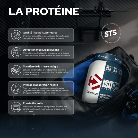 ISO 100 Hydrolyzed (Dymatize): Purity for your muscles Renowned worldwide, this hydrolyzed protein isolate is ultra-fast absorbing. With no unnecessary fats or sugars, it nourishes your muscles after exercise to maintain tone while limiting calorie intake. It's the ideal choice for satiety and recovery.