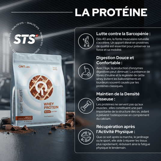 This pack brings together four pharmaceutical-grade food supplements carefully selected to work in synergy: Light Digest Whey Protein to maintain your muscle mass, QNT Collagen to preserve your skin and joints, Joint+ to strengthen your bone and joint structure, and Creatine Monohydrate to improve your strength and cognitive abilities. All accompanied by a practical shaker to facilitate your daily routine. Products you'll find in Swiss pharmacies, a guarantee of quality and confidence.