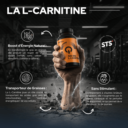 L-Carnitina 500 mg: attivate la vostra energia La L-Carnitina svolge un ruolo essenziale nel trasporto degli acidi grassi verso i mitocondri, dove vengono bruciati per produrre energia. Vi aiuta ad attingere alle vostre riserve di grasso sostenendo al contempo la vostra resistenza durante le sessioni di allenamento.