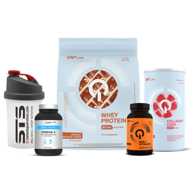 Questa confezione riunisce quattro integratori alimentari di qualità farmaceutica, accuratamente selezionati per lavorare in sinergia: le Proteine Whey Light Digest per nutrire i muscoli e mantenere il tono, il Collagene QNT per preservare la giovinezza e la bellezza dall'interno, l'Omega-3 Care per proteggere il cuore e il cervello e le Vitamine Quotidiane per compensare eventuali carenze e rafforzare le difese immunitarie. Prodotti che potete trovare nelle farmacie svizzere, garanzia di qualità e fiducia.