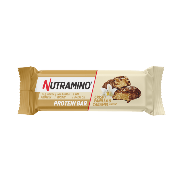La barretta proteica Nutramino è una barretta proteica senza zuccheri aggiunti e senza olio di palma, con una delicata combinazione di croccanti perle di soia, caramello dolce e centro di vaniglia, il tutto ricoperto da un sottile strato di cioccolato al latte.