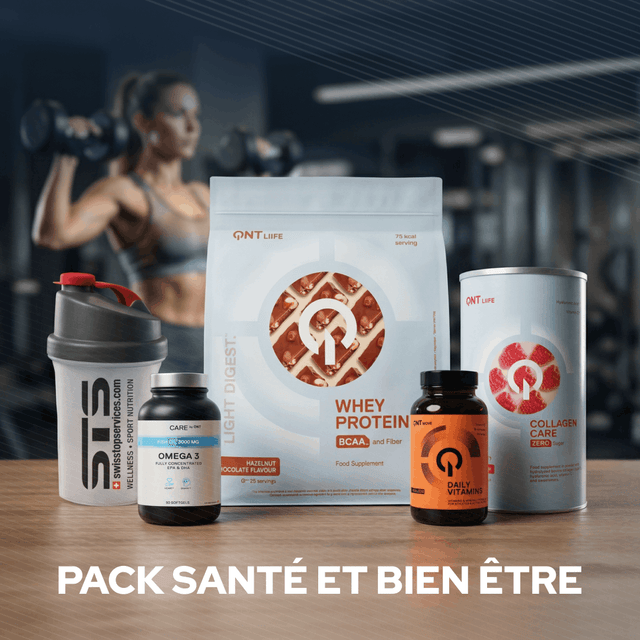 Ce pack réunit quatre compléments alimentaires de qualité pharmaceutique soigneusement sélectionnés pour agir en synergie : la Light Digest Whey Protein pour nourrir vos muscles et maintenir votre tonus, le Collagène QNT pour préserver votre jeunesse et votre beauté de l'intérieur, les Oméga-3 Care pour protéger votre cœur et votre cerveau, et les Daily Vitamins pour combler toutes vos carences et booster votre immunité. Des produits que vous retrouvez dans les pharmacies suisses, gage de qualité et de confiance.